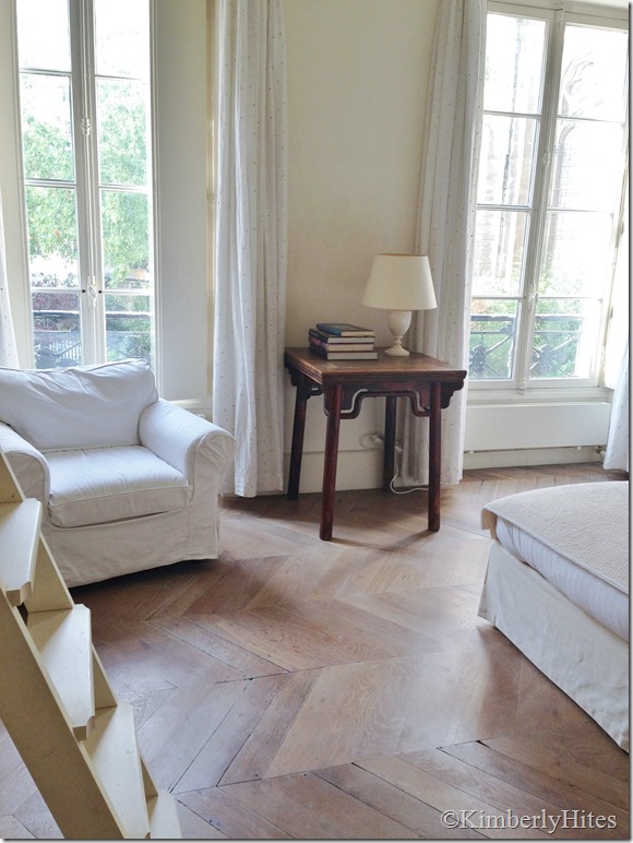 My personal favorite element in the room was the original herringbone floors that had been bleached to a lighter grayish-brown hue. It gave the appearance as though they could be limed-oak.